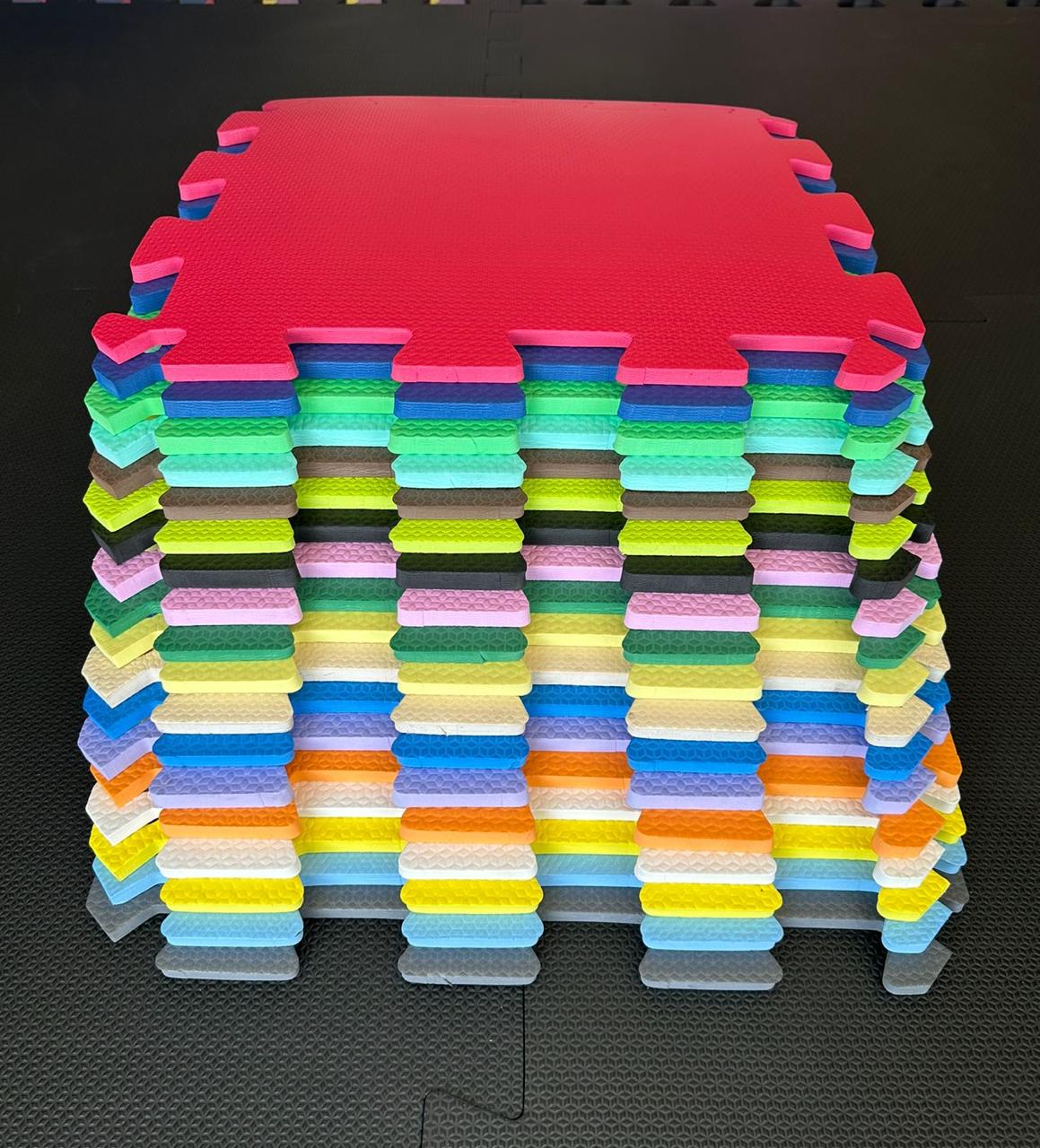 Tatames de 1 cm de espessura, com superfície antiderrapante, encaixe perfeito e tecnologia de memória de retorno.